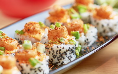 Camarón empanizado, aguacate y queso crema por dentro; con camarón roca, cebollín y ajonjolí por fuera.