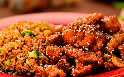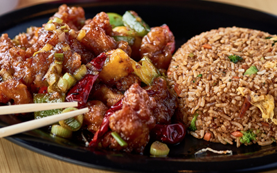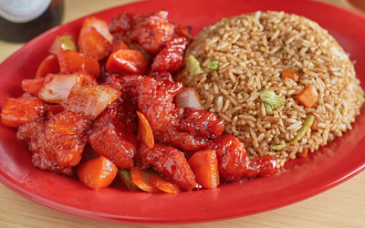 Riquísimo platillo de pollo acompañado de pimiento verde y rojo, piña, cebolla cambray y chile de árbol, mezclados con una deliciosa salsa dulce servido sobre una cama de fideos crujientes. (Picoso bajo).