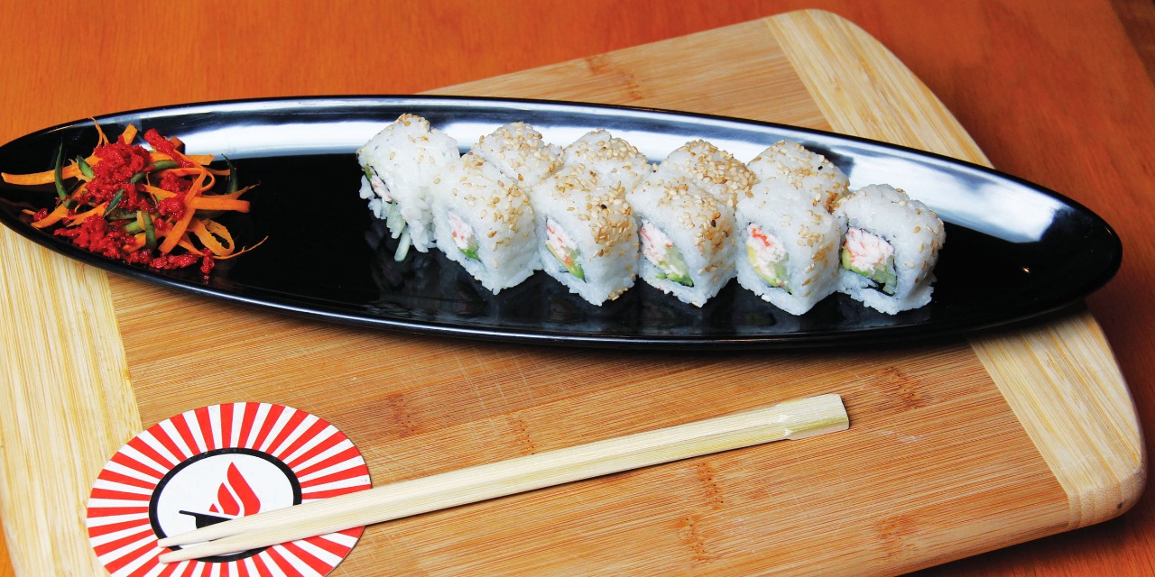 Pasta de surimi, pepino y aguacate por dentro, ajonjolí dorado por fuera.