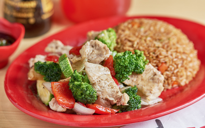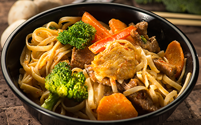 Combinación de pasta oriental con pollo y carne a la plancha acompañada de brócoli, zanahoria y pimiento rojo, sazonada con nuestra salsa especial de la casa.