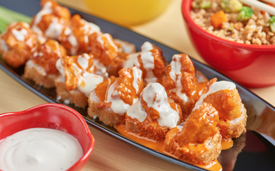 Pollo capeado con zanahoria y aguacate por dentro; pollo bañado en salsa búfalo con un toque de aderezo blue cheese por fuera. Rollo caliente empanizado.
