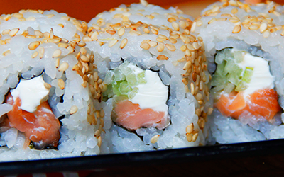 Salmón y pepino; queso crema por dentro y ajonjolí por fuera.