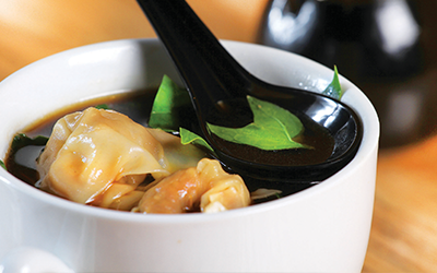 Consomé de pollo con espinacas y ravioles rellenos de carne y camarón.