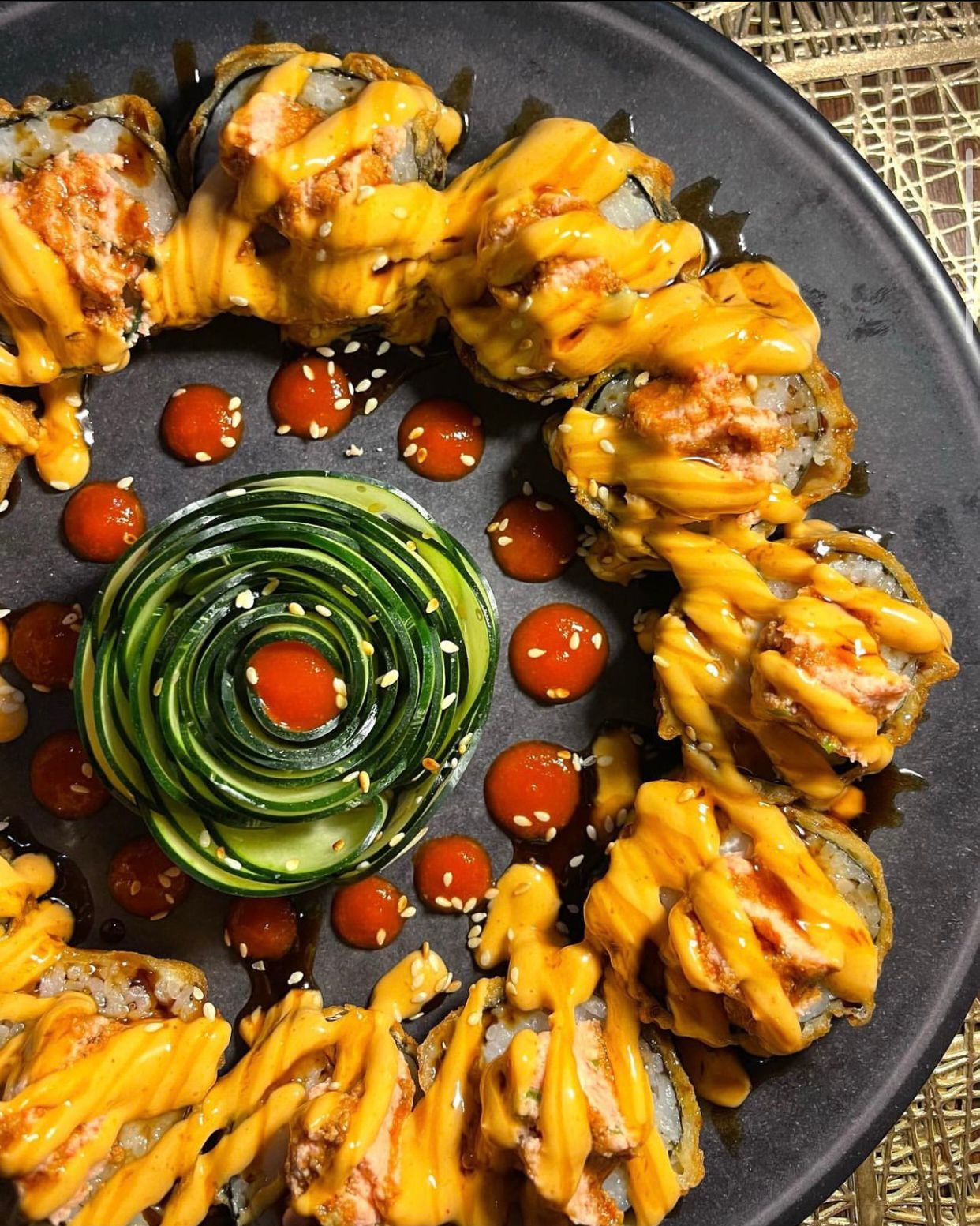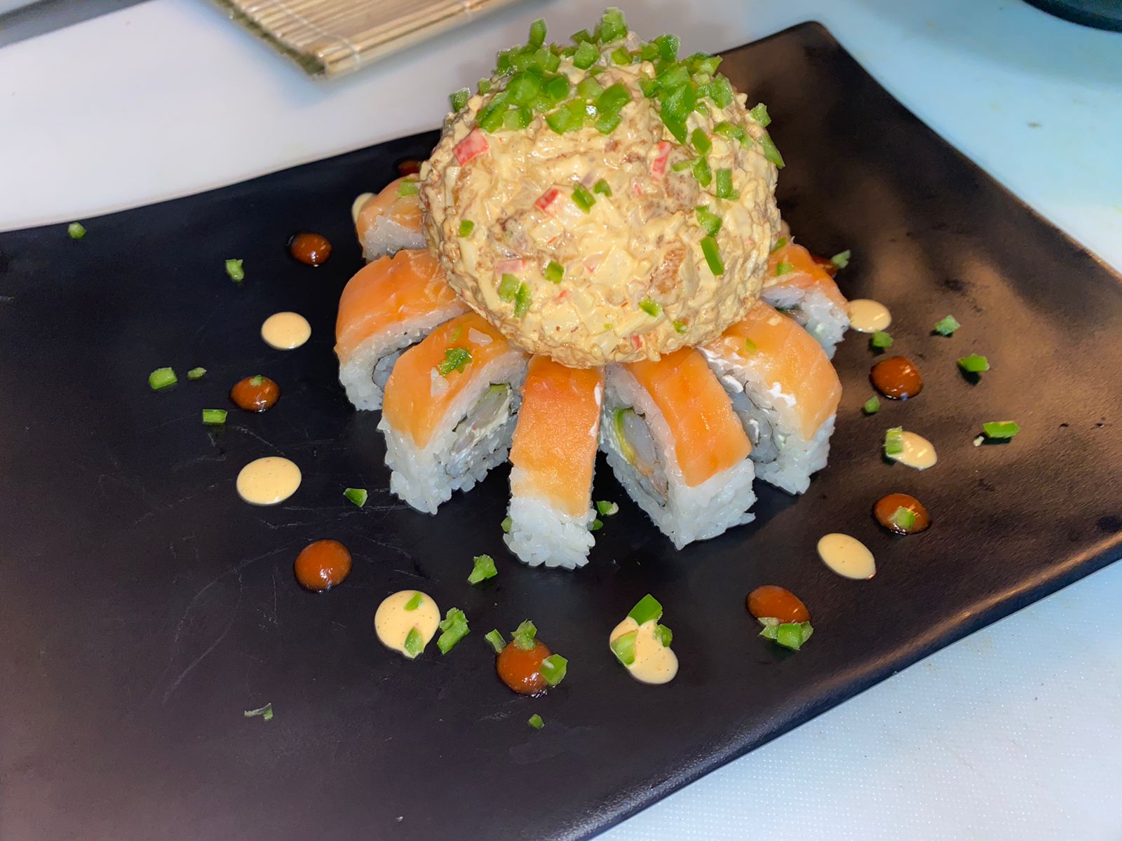 Salmon Horneado, queso crema, aguacate, tampico por dentro, atun fresco por fuera, cubierto en Oro
