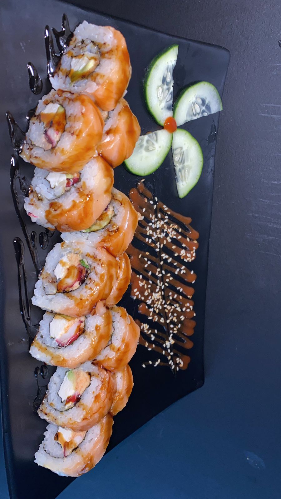 Rollo Capeado, Salmon Horneado, Queso Crema, Aguacate, Salsa Tampico por encima