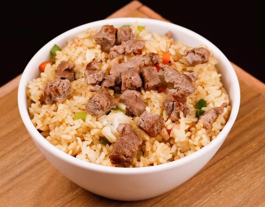 Arroz frito, pollo, T-bone, cebolla cambray, brocoli y zanahoria