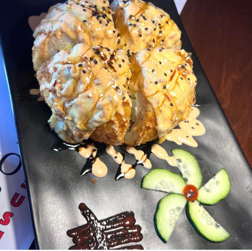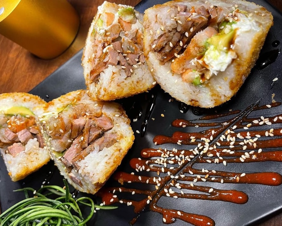 Bola de arroz empanizada, rellena de queso crema. Proteina a elegir, Camarones, Carne de Res o de Tampico, bañado en salsa macha.