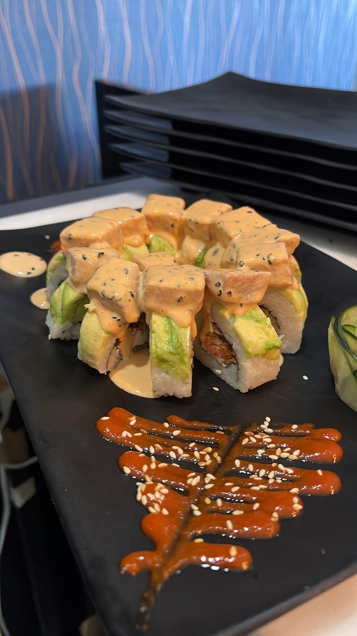 Pulpo, Tampico, Queso Crema, Aguacate, Salmon y Camaron por fuera, Bañado en salsa anguila