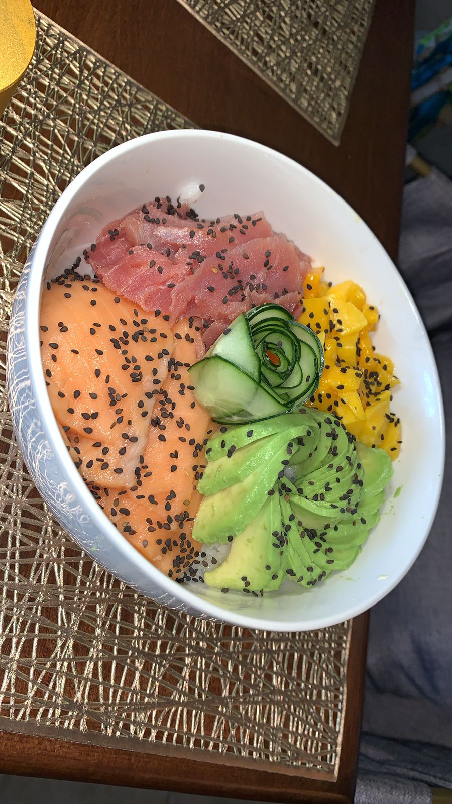 Salmon y Atún, Mango en laminas o cubos, Edemames, Aguacate en Láminas, Arroz para sushi, Semillas de ajonjoli