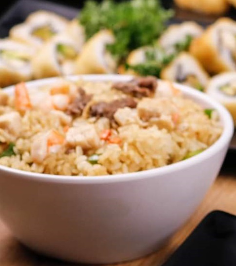 Arroz Blanco o Frito, Verduras, Pollo, Carne, Camaron, Tocino dorado, queso crema.