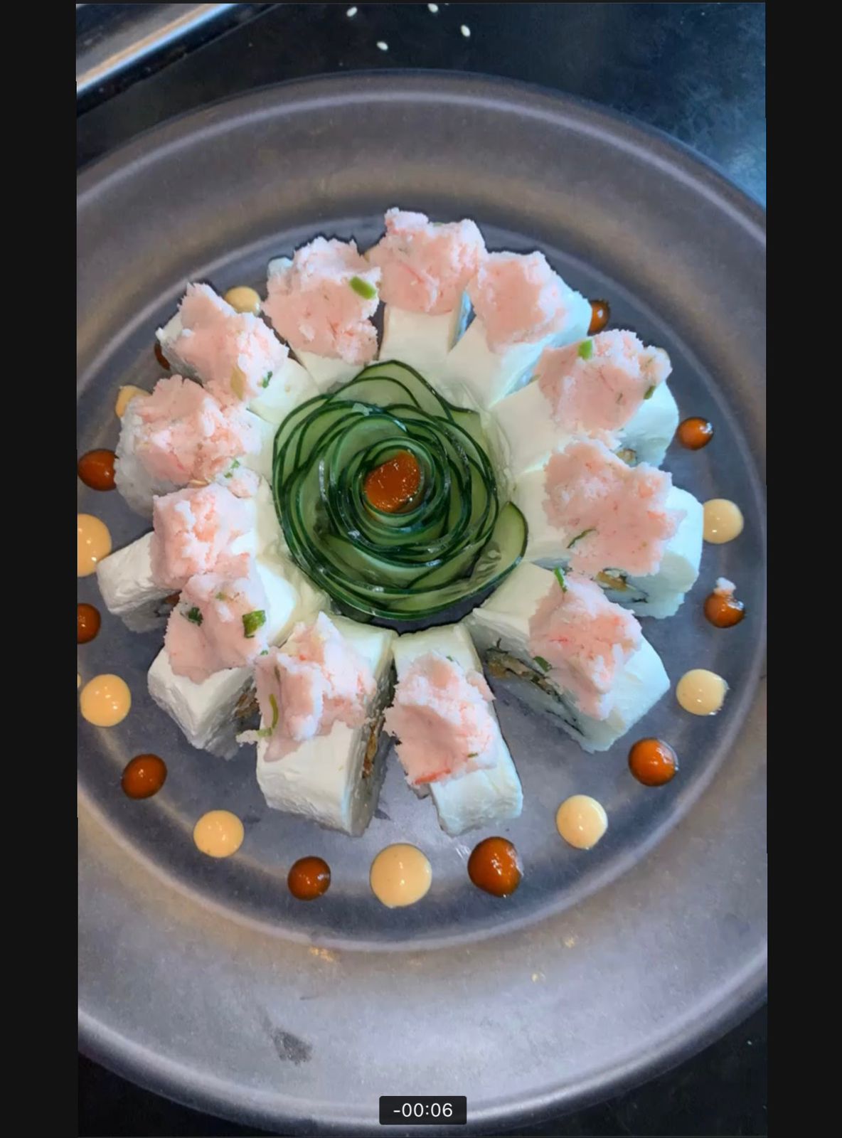 Pepino rallado, Salmon, Pulpo, Camaron, Surimi, Bañado en vinagre preparado.