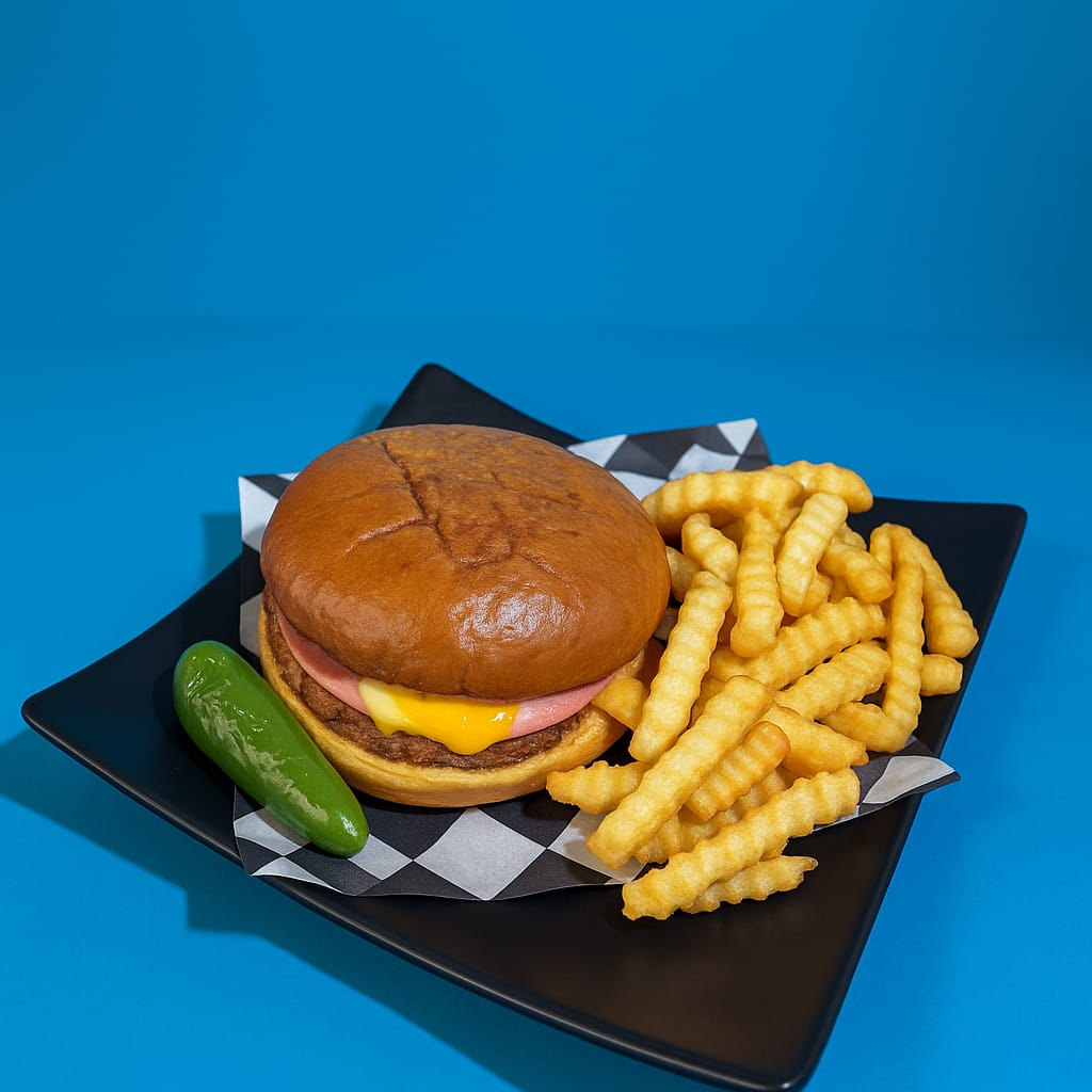 PAN ARTESANAL, CARNE SIRLOIN, JAMON, QUESO MOZZARELLA, QUESO AMERICANO, Y ORDEN DE PAPAS SAZONADAS