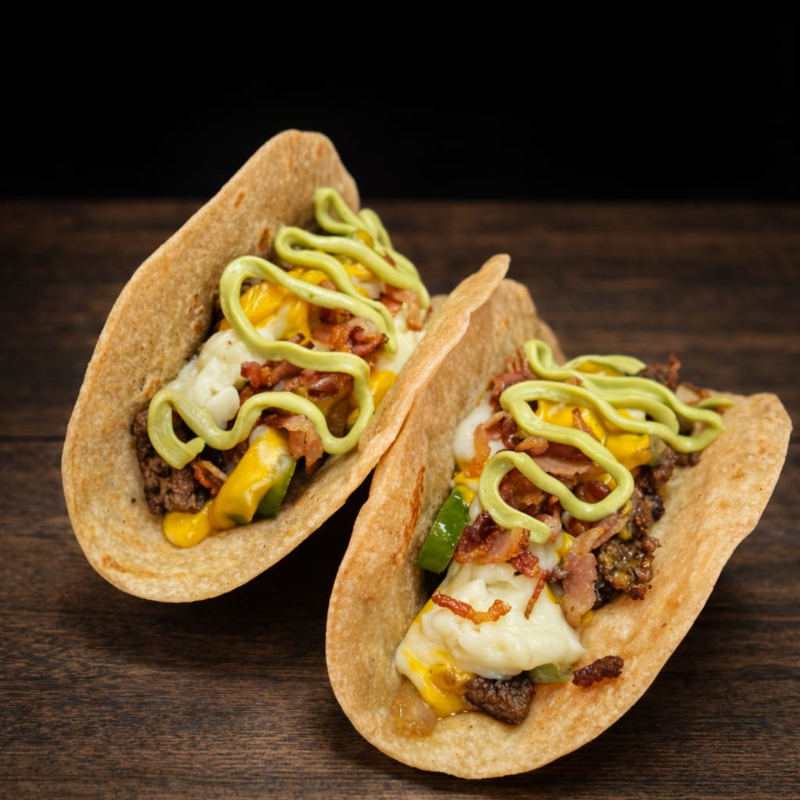 2 TACOS EN TORTILLA DE HARINA, CARNE SIRLOIN PARA HAMBURGUESA, TOCINO, QUESO AMERICANO, QUESO MOZZARELLA, SERRANO EN RODAJAS FRITO, CEBOLLA FRITA, DIP DE AGUACATE