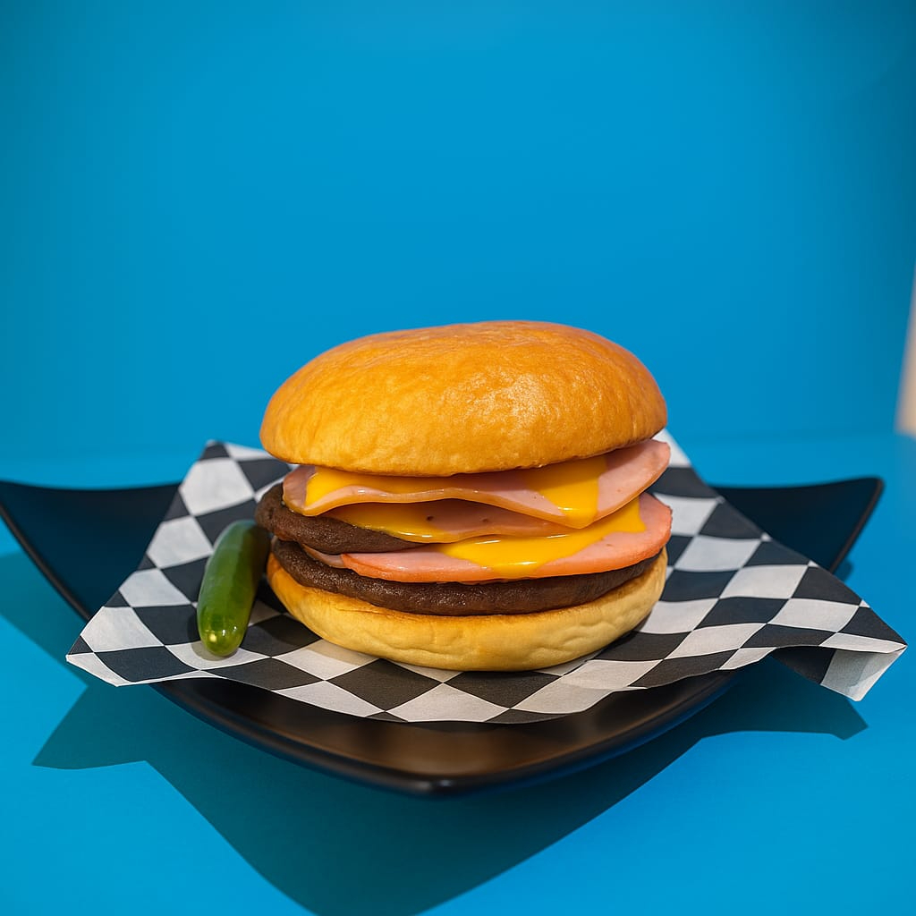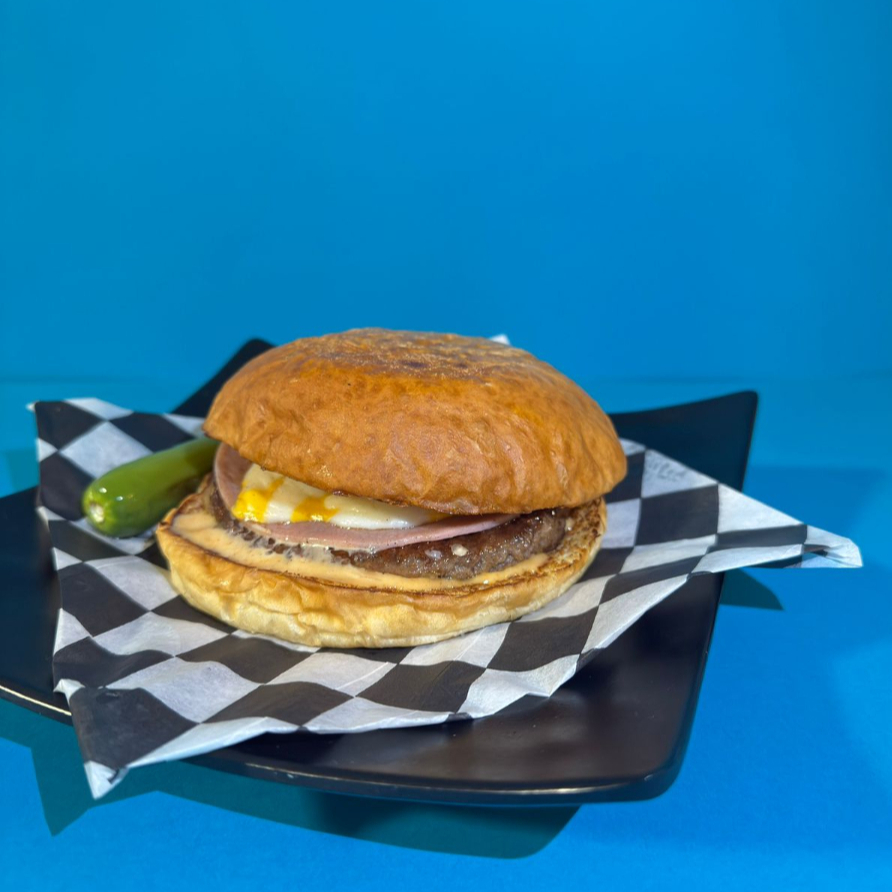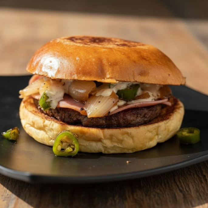 PAN ARTESANAL, CARNE SIRLOIN, JAMON, QUESO MOZZARELLA Y QUESO AMERICANO