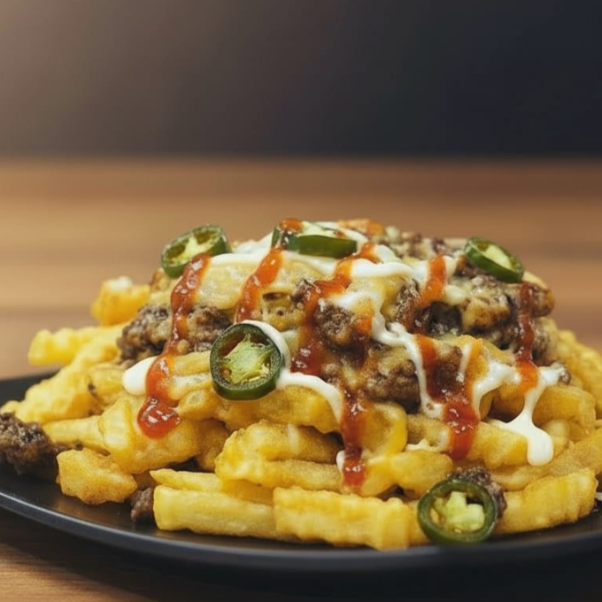 PAPAS FRITAS, CARNE DE SIRLOIN PARA HAMBURGUESA, TOCINO, SERRANO FRITO, CEBOLLA FRITA, ADEREZO DE LA CASA, MAYONESA, CAPSUT
