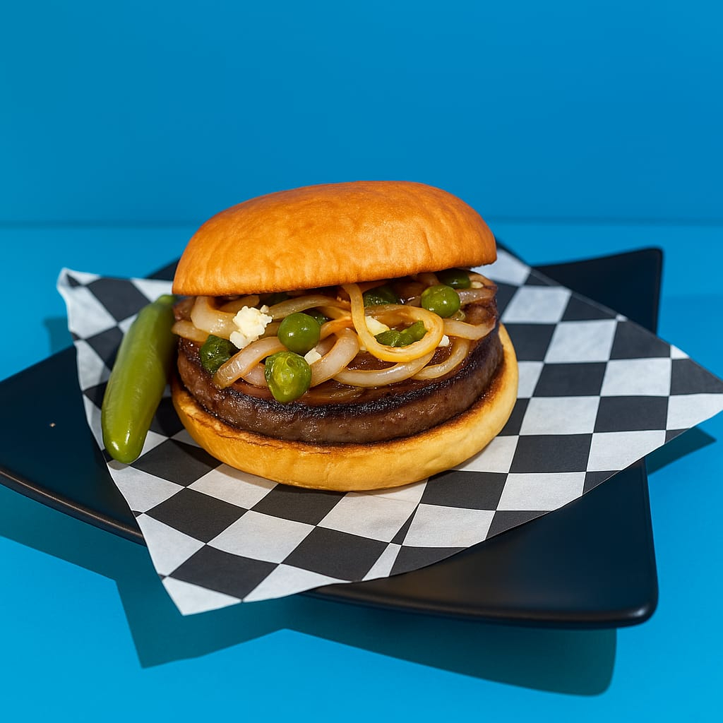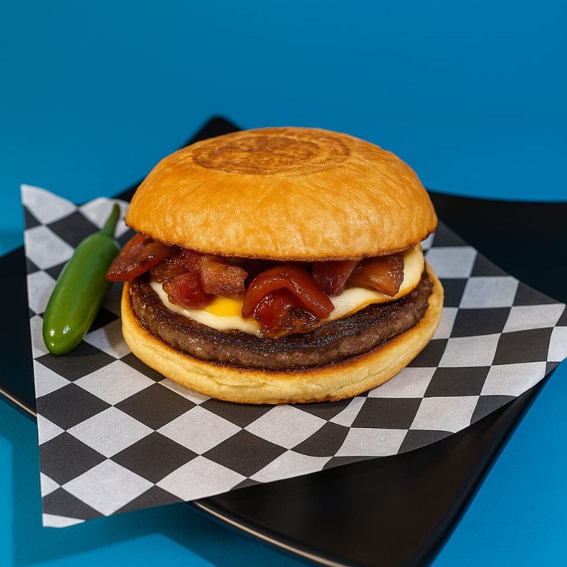 PAN ARTESANAL, CARNE SIRLOIN, CHILE SERRANO Y CEBOLLA FRITOS, TOCINO, JAMON, QUESO MOZZARELLA Y QUESO AMERICANO
