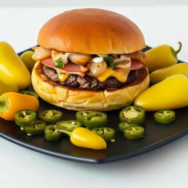 CARNE SIRLOIN, PAN ARTESANAL, CHILE SERRANO, CHILE GUERO FRITOS, CEBOLLA FRITA,TOCINO, JAMON, QUESO MOZZARELLA Y QUESO AMERICANO, MAYONESA Y ADERAZO DE LA CASA