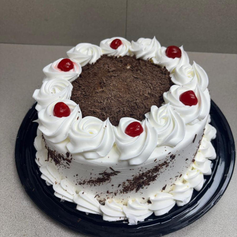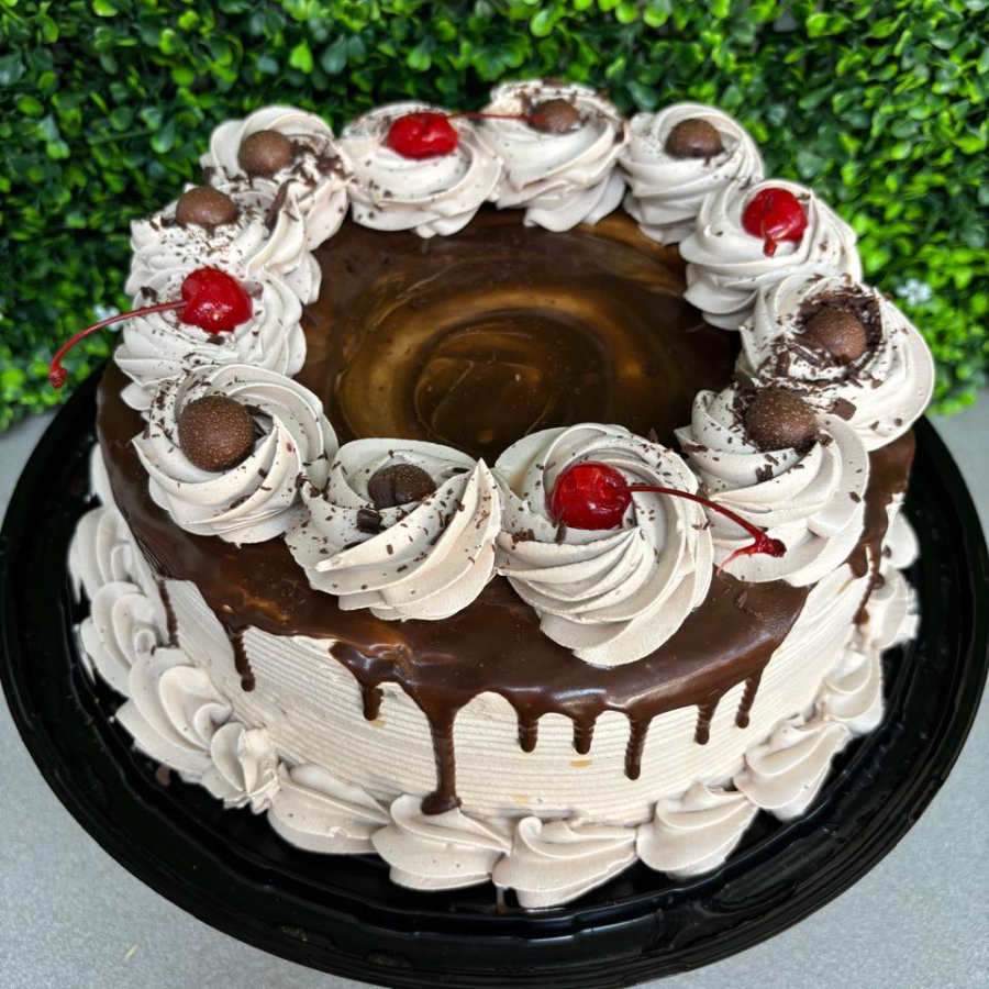 Pan de chocolate, húmedo jarabe de tres leches, decorado con fresas y nuez.