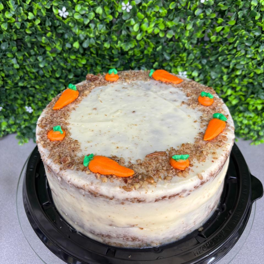 Pan de vainilla, húmedo jarabe de tres leches, decorado con fresas y nuez.