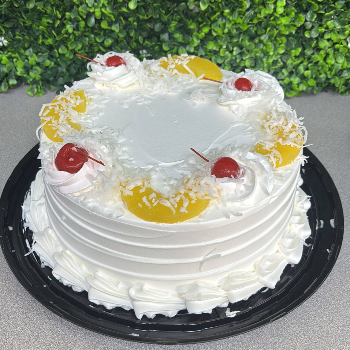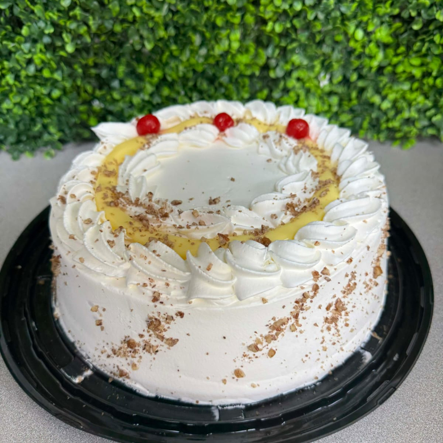 Pan de vainilla con mermelada de piña al centro, cubierta de crema, coco, cereza y piña.