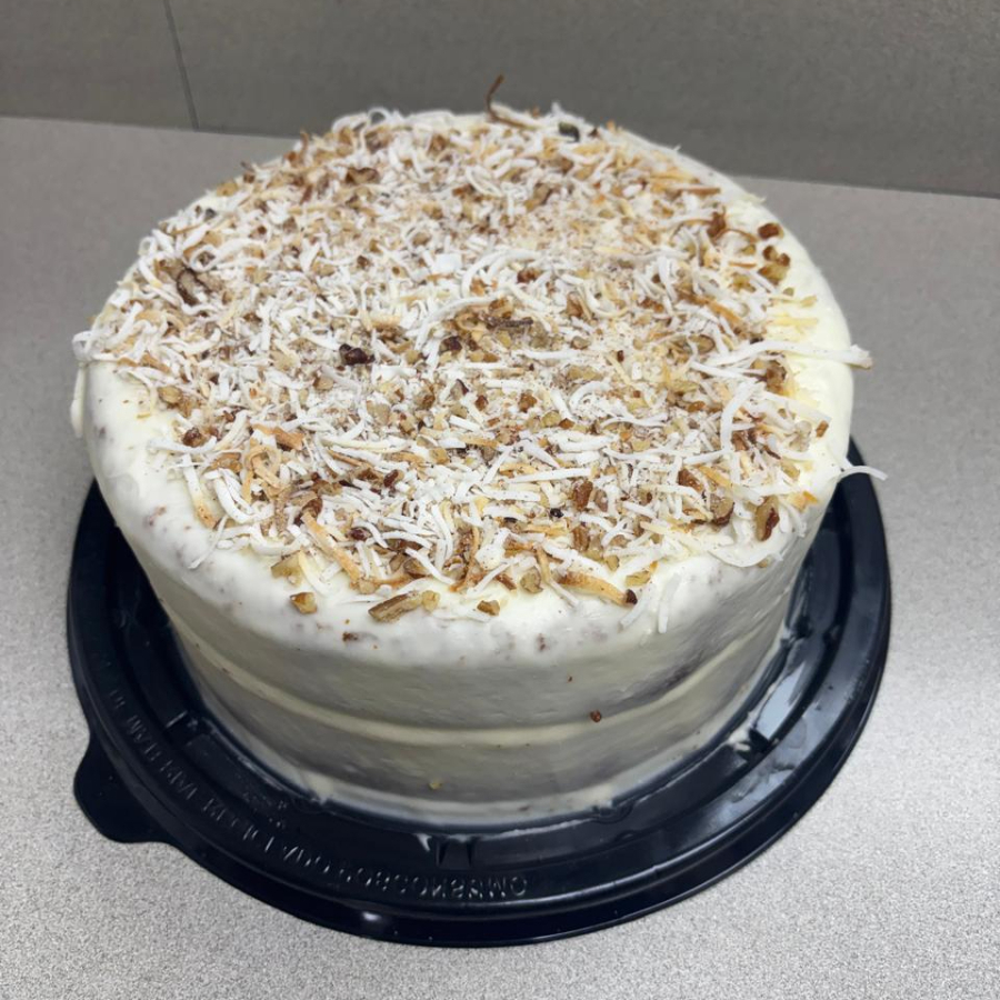 Pan vainilla con canela, nuez y coco, cobertura con queso, nuez y coco tostado.