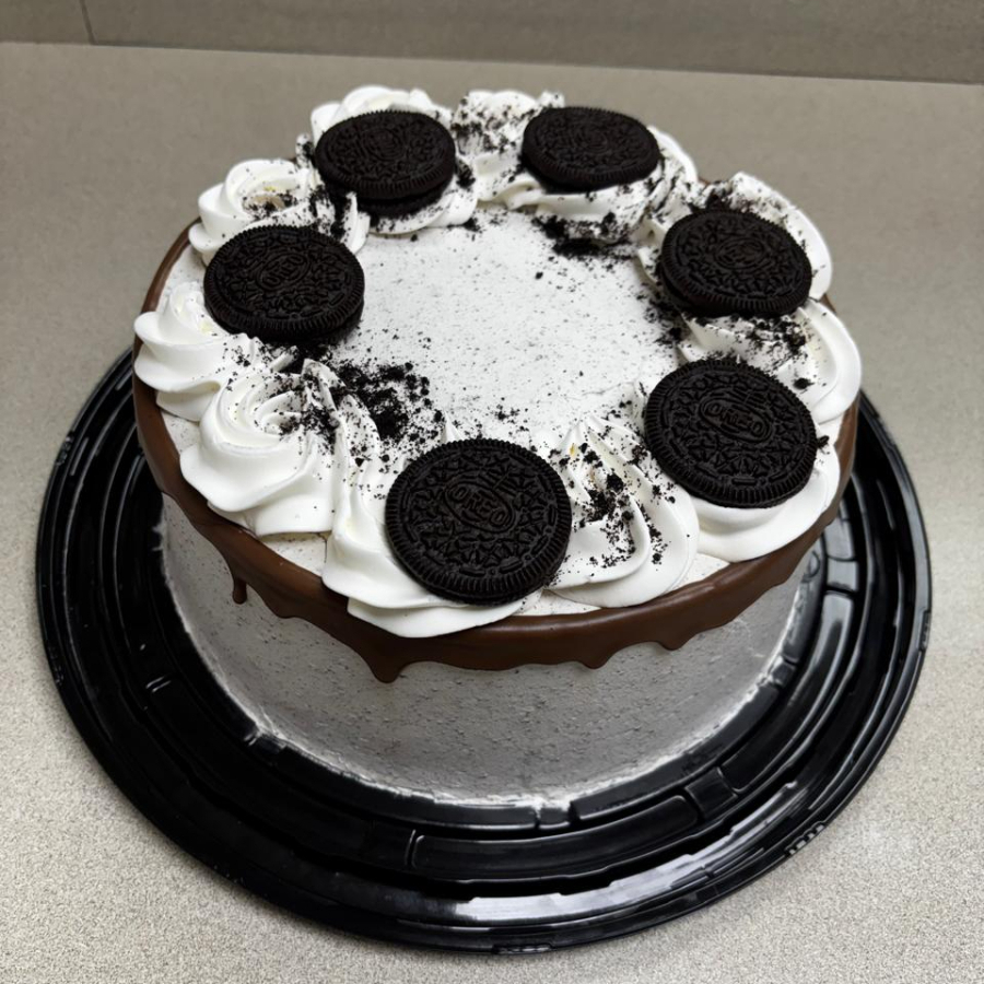 Pan de chocolate, cubierta de crema oreo, escurrido de chocolate y corona de galletas.