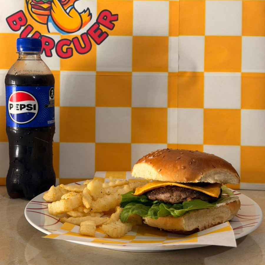 Carne de res, queso blanco o amarillo, tomate, cebolla, mostaza, pepinillos, mayonesa, lechuga