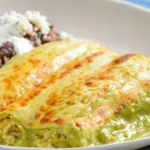 4 tacos cubiertos de salsa Verde y queso gratinado, frijoles