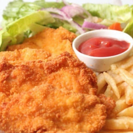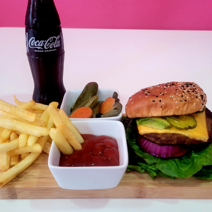 Carne de Sirloin,tocino,queso Amarillo,lechuga,tomate,cebolla y pepinillos, acompanado de papas fritas