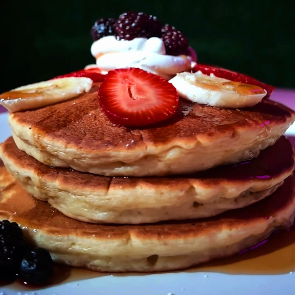 3 Hot Cakes con fruta ( platano o fresa) con crema batida, jarabe de caramelo o chocolate