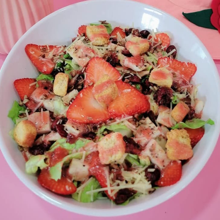 Ensalada de lechuga, espinacas, fresas, arandanos, nuez, pechuga de pollo,parmesano ,crutones y vinagreta de Fresa o binagre balsamico
