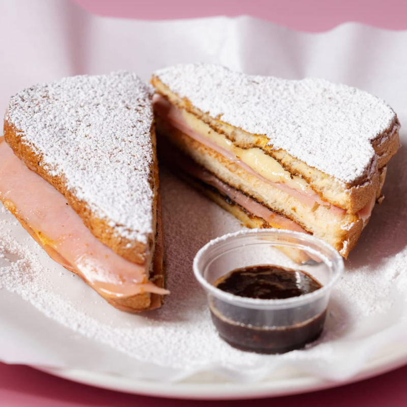 Sandwich relleno de jamon y queso manchego, capeado y dorado a la plancha , acompanado de salsa Berrybom