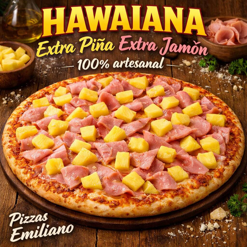 Pizza 1/4 pepperoni, 1/4 jamón con piña, 1/4 longaniza y 1/4 champiñón.