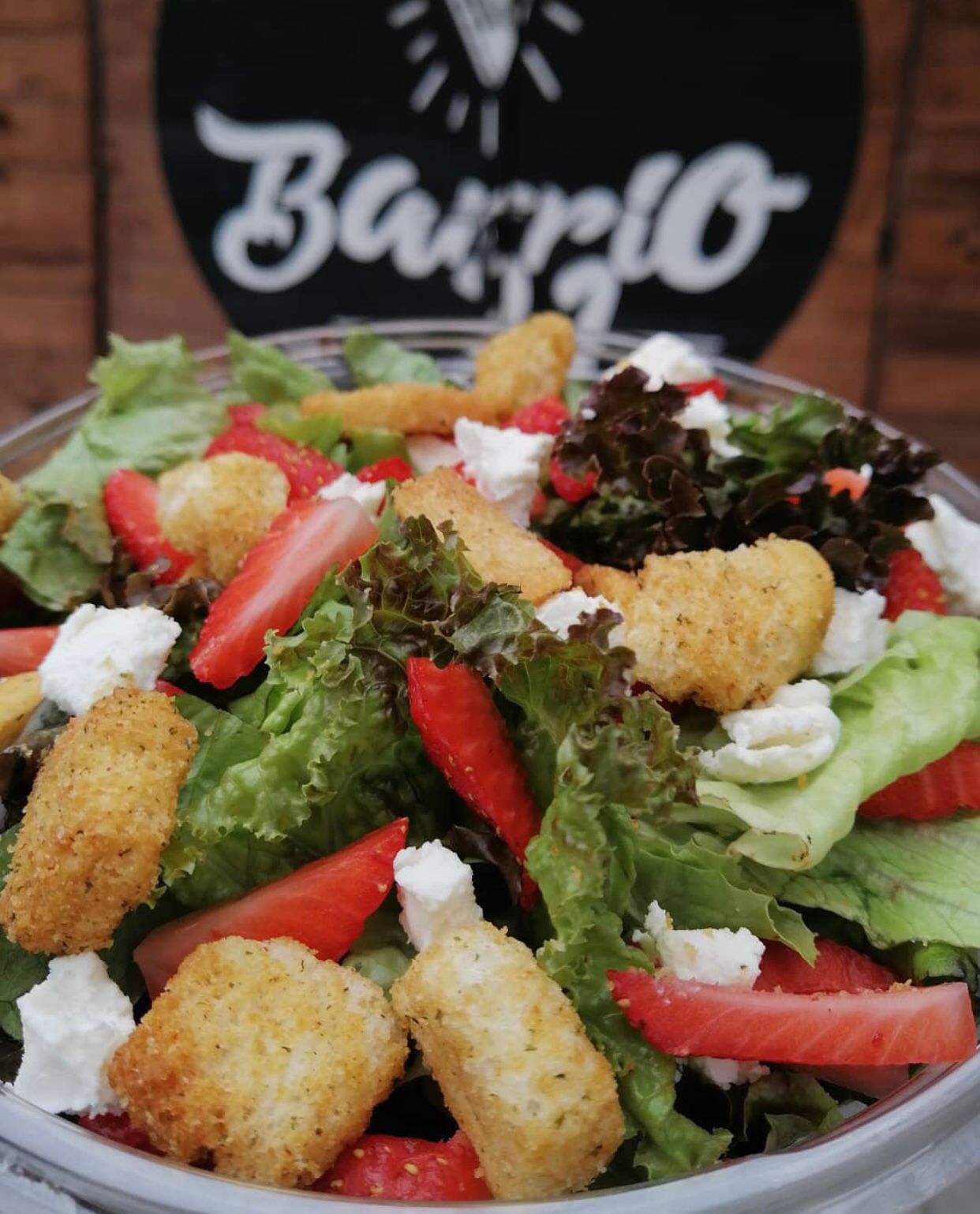 Vegetales frescos, espinaca, tomate cherry, cebolla morada, aceitunas, pimientos, champiñones y queso cabra
