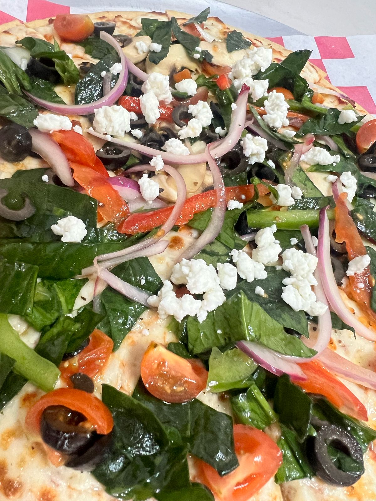 Espinacas, champiñones, cebolla morada, aceituna y pimientos.
