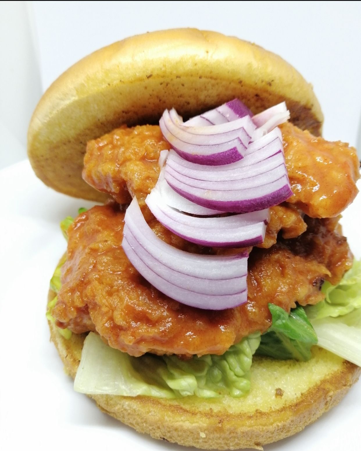 pechuga de pollo empanizada bañada en salsa buffalo lechuga, cebolla morada y aderezo