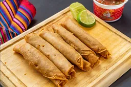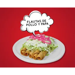 Deliciosas flautas de pollo (5 piezas) acompañadas de lechuga, queso, crema, cebolla morada y su salsa de tomate.