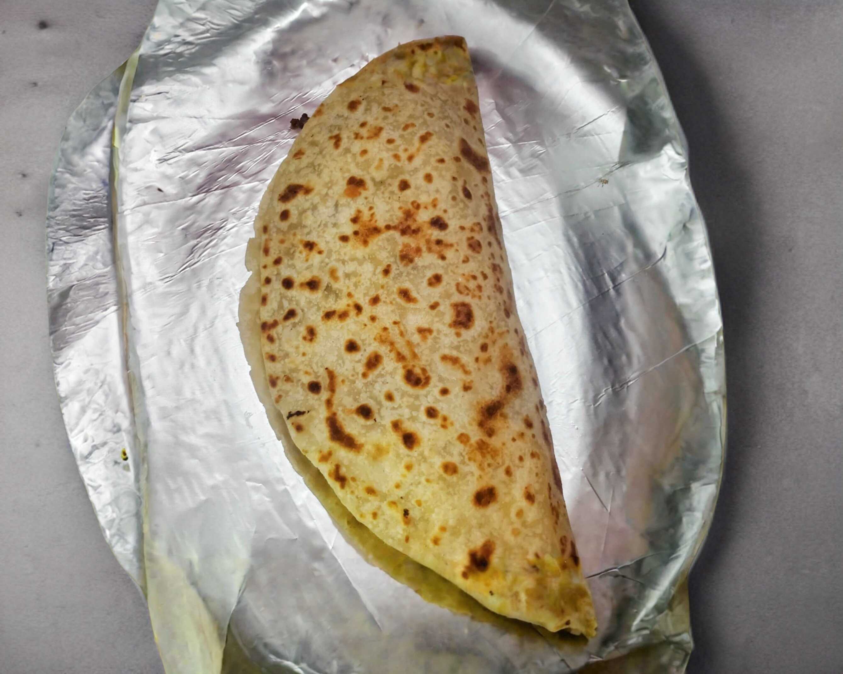 Rica torta de fajita de res, aguacate, queso, cebolla, morron asado, jamon, y mantequilla