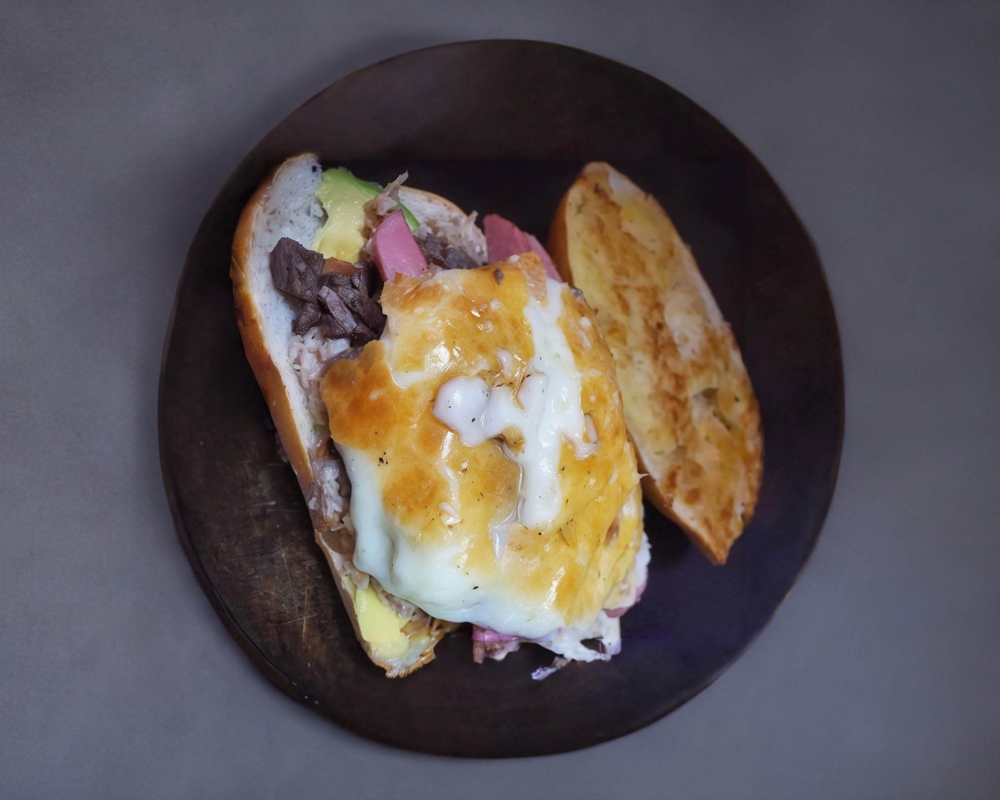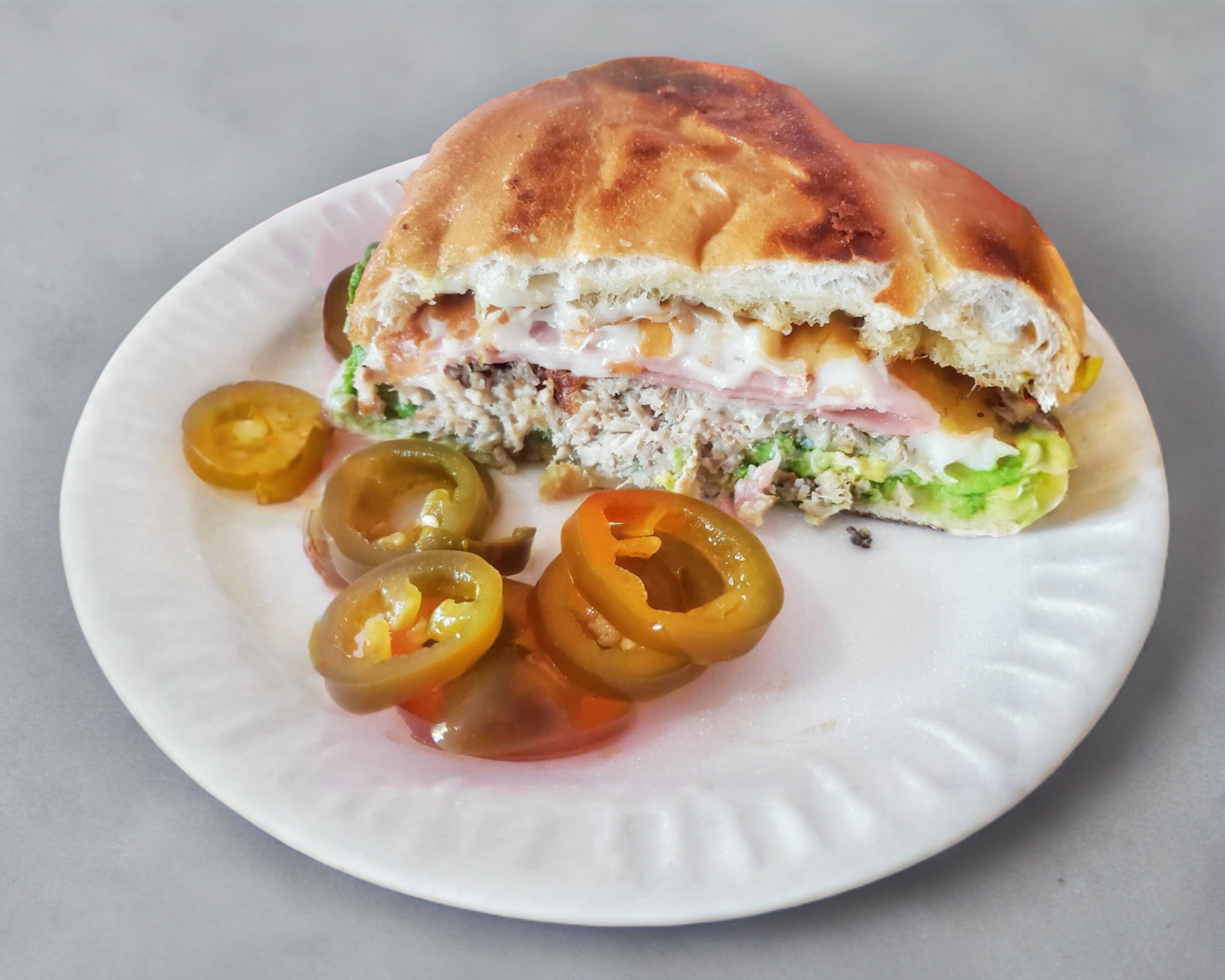 Rica torta de pierna de puerco, asadero, jamon, aguacate, y mantequilla