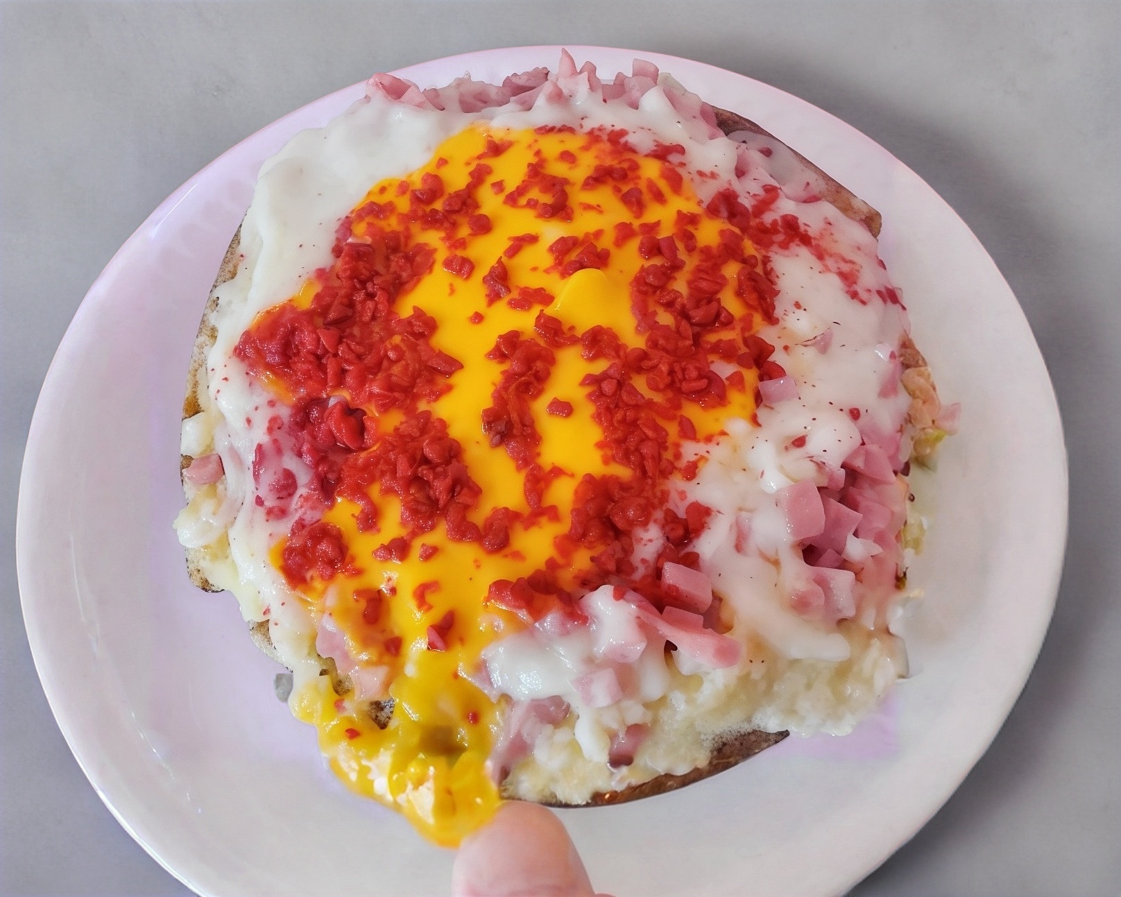 Rica papa rellena de mantequilla, jamon, queso asadero, queso amarillo, tocino, y crema