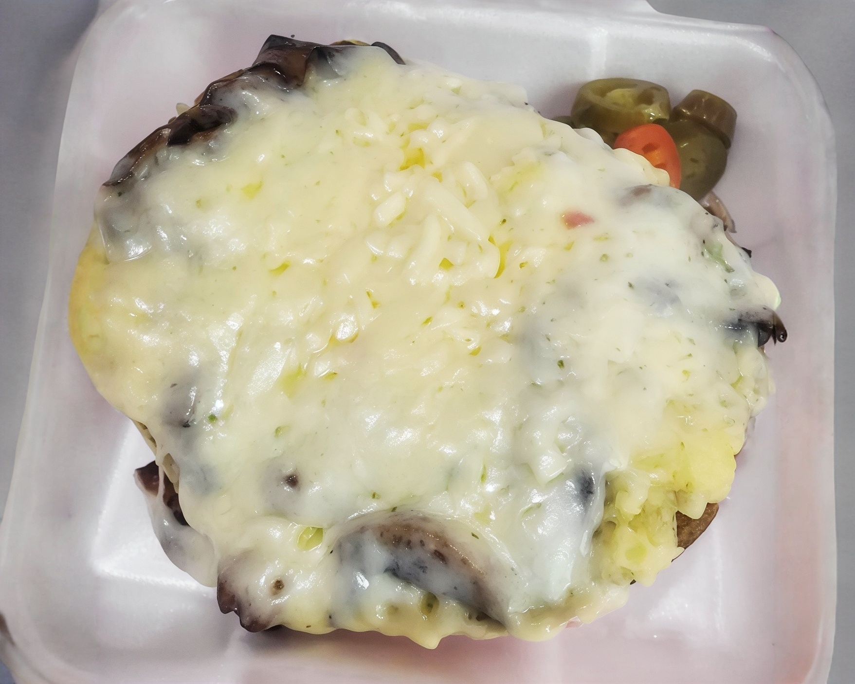 Rica papa rellena de mantequilla, champiñones, y queso asadero