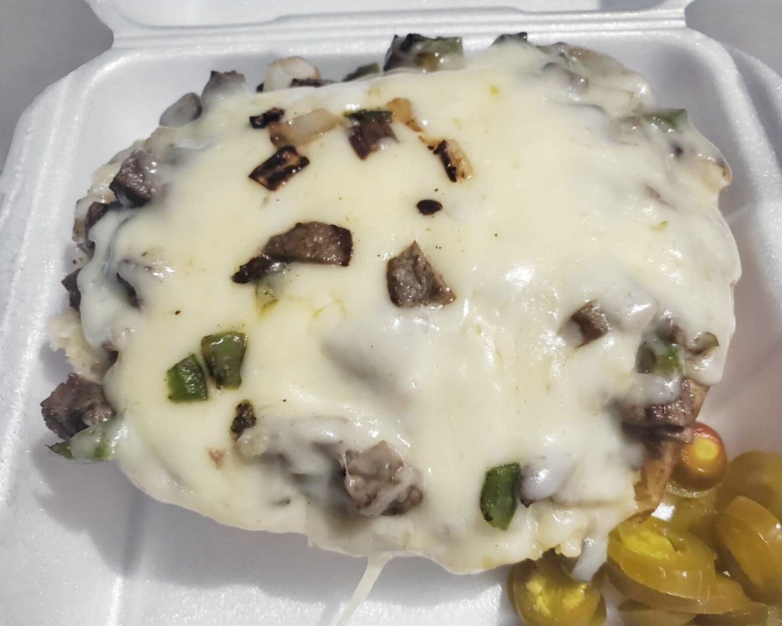 Rica papa rellena de mantequilla, fajita, cebolla, morron asado, y queso asadero
