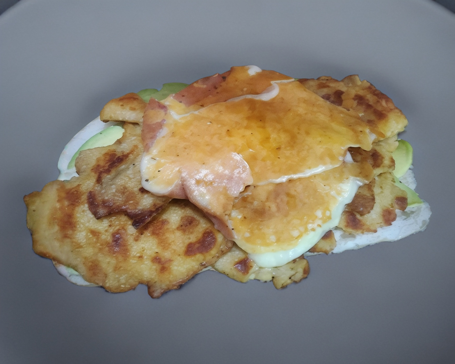 Rica torta de fajita de res, pierna, jamon, salchicha, mantequilla, queso, y aguacate