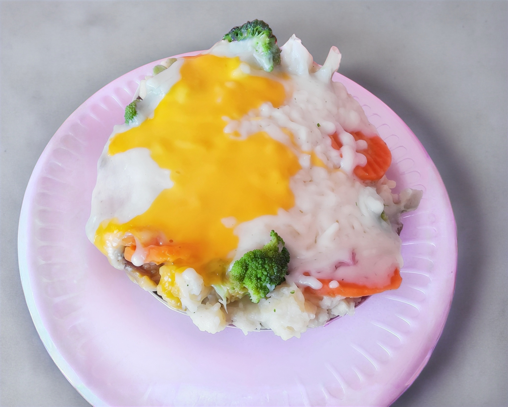 Rica papa rellena de mantequilla, brocoli, coliflor, zanahoria, queso asadero, y queso amarillo