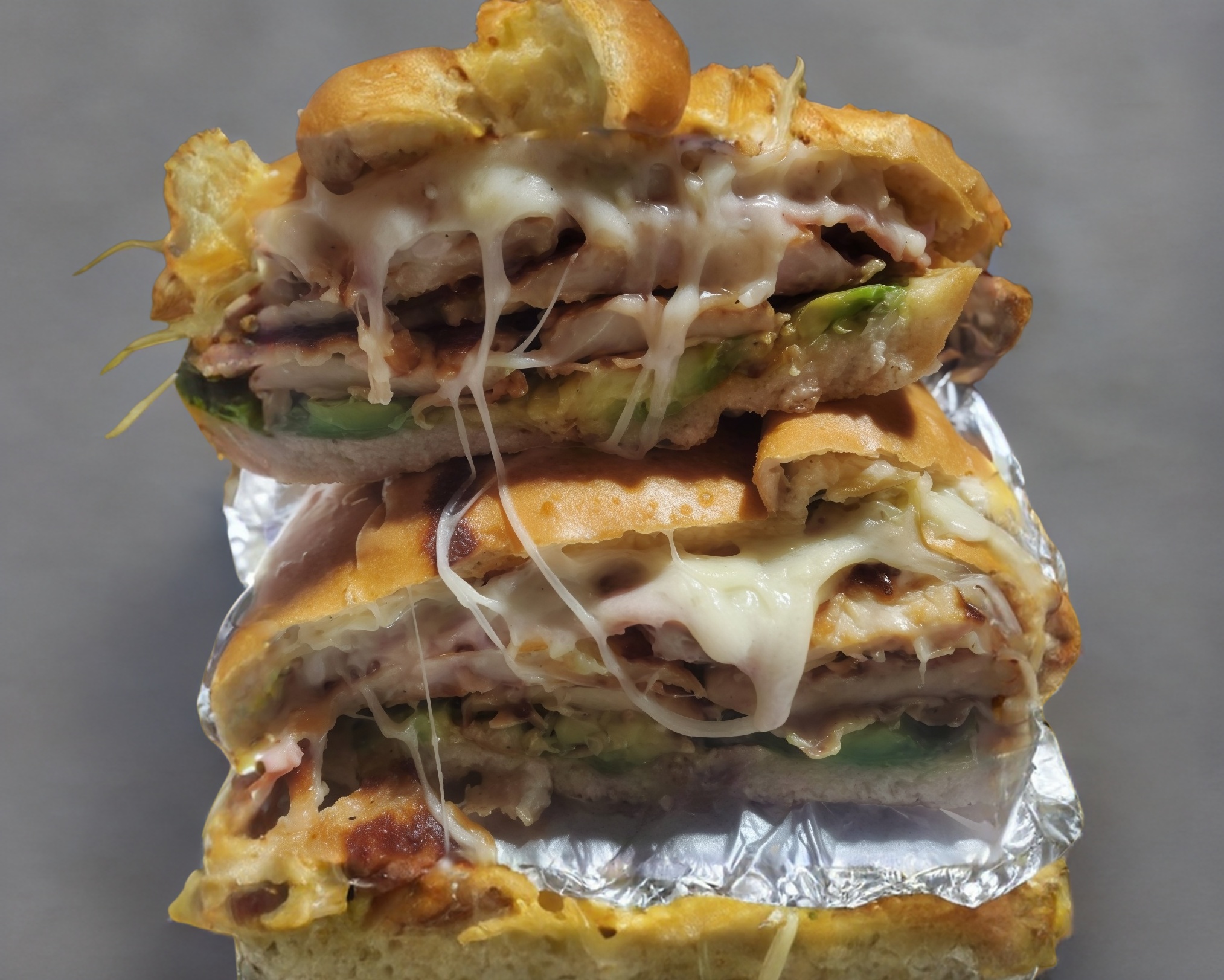 Rica torta de milanesa de pollo, jamon, mantequilla, queso chihuahua y aguacate