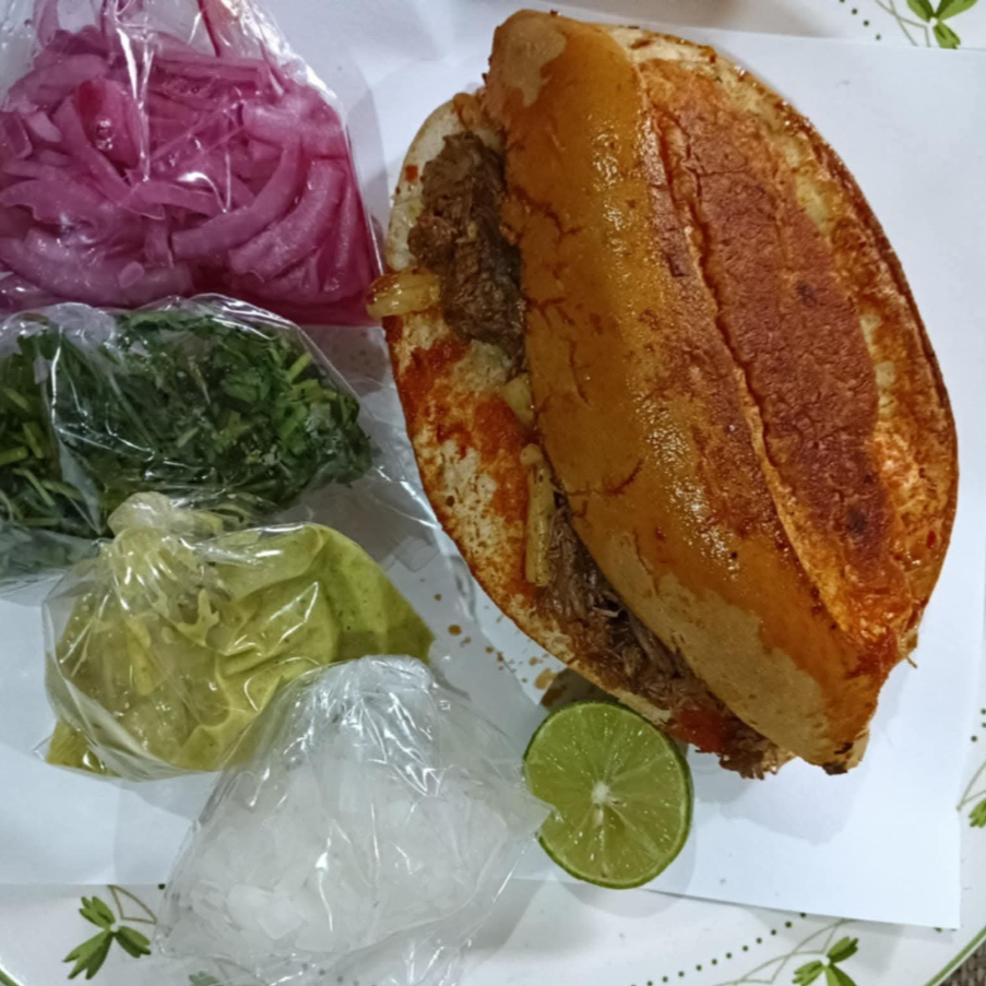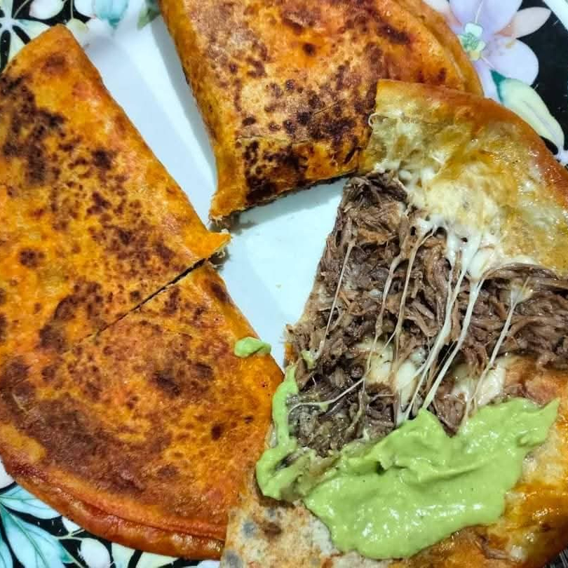 Quesabirria en tortilla de harina doradita rellena de birria jugosa y queso derretido, ideal para mojar en consomé