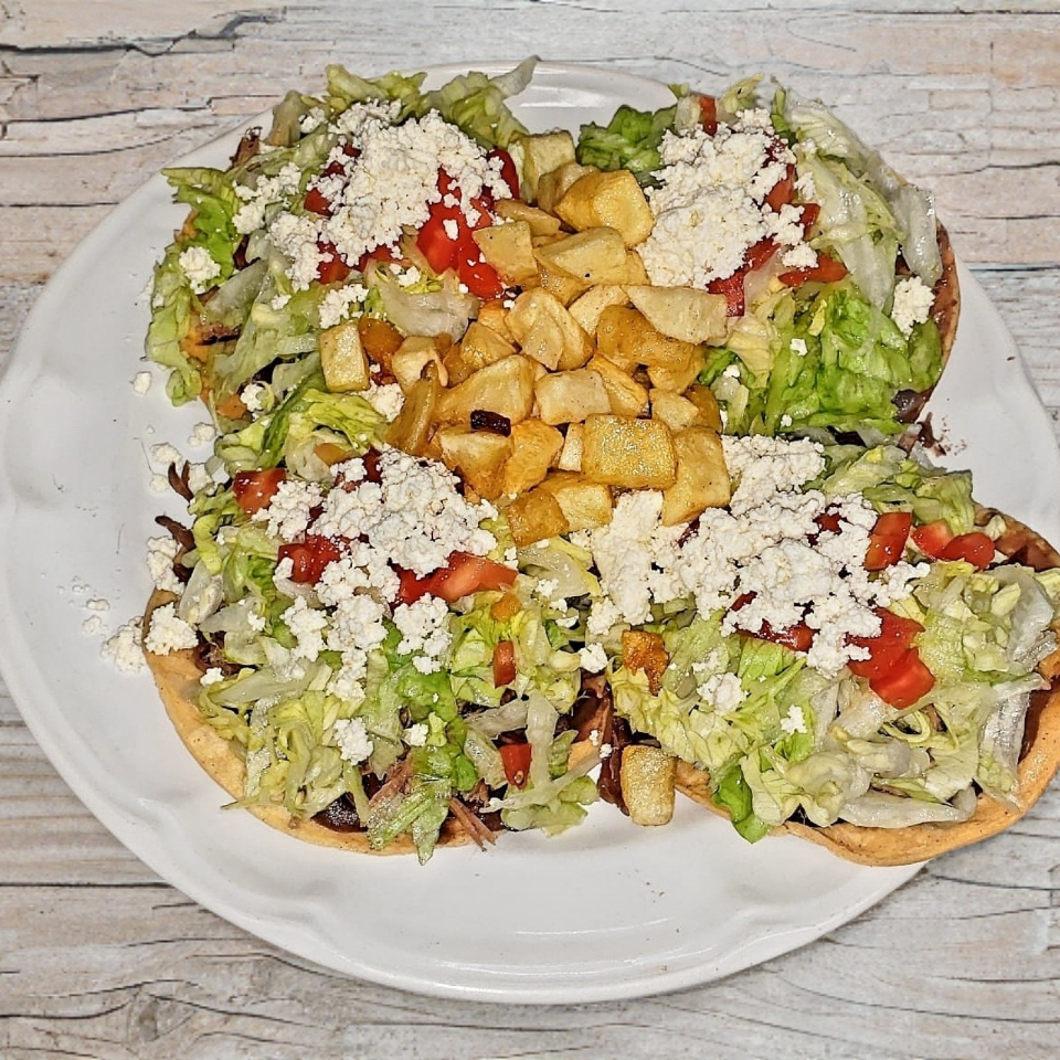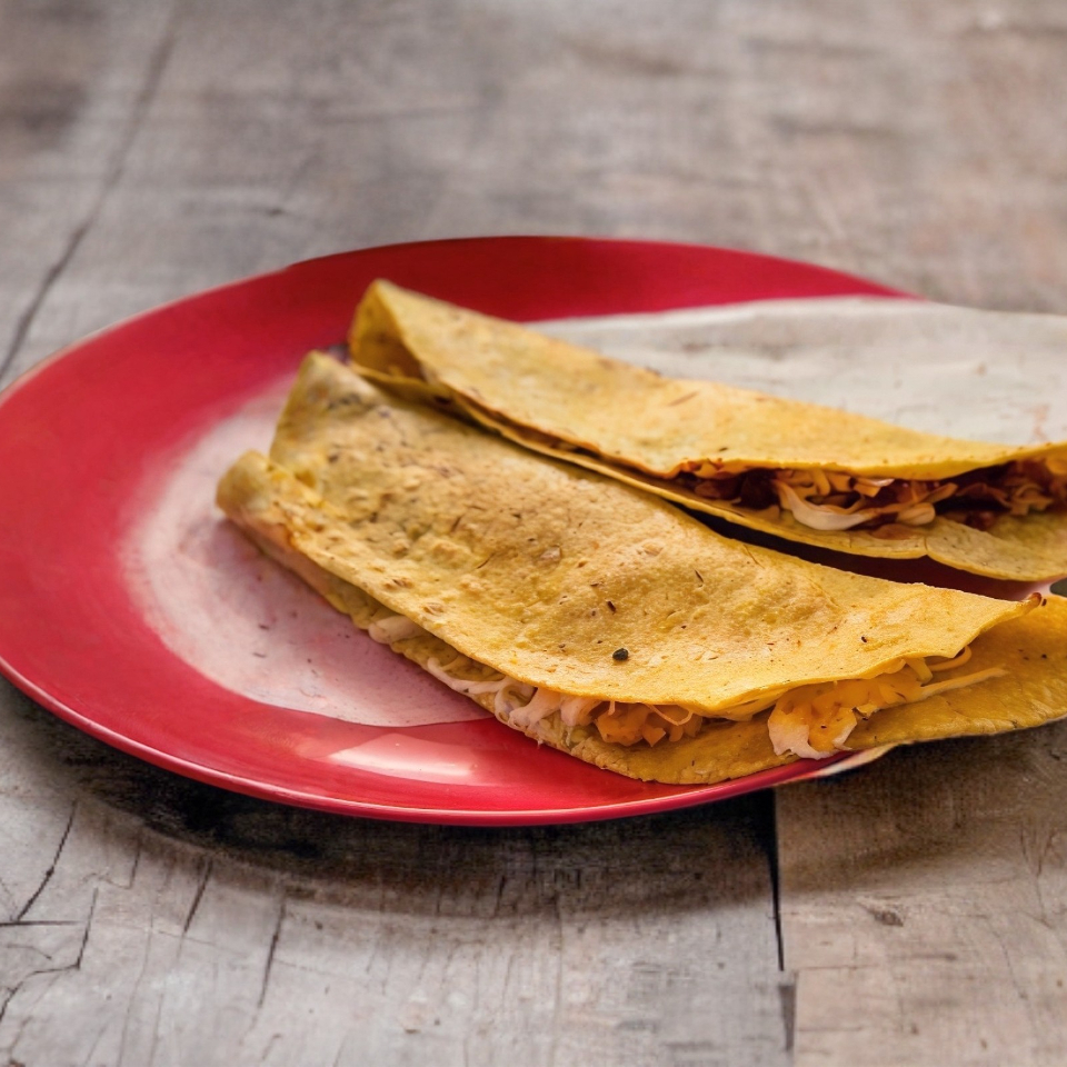 Tacos rojos rellenos de desenfada natural con frijoleS negros acompañados de ensalada