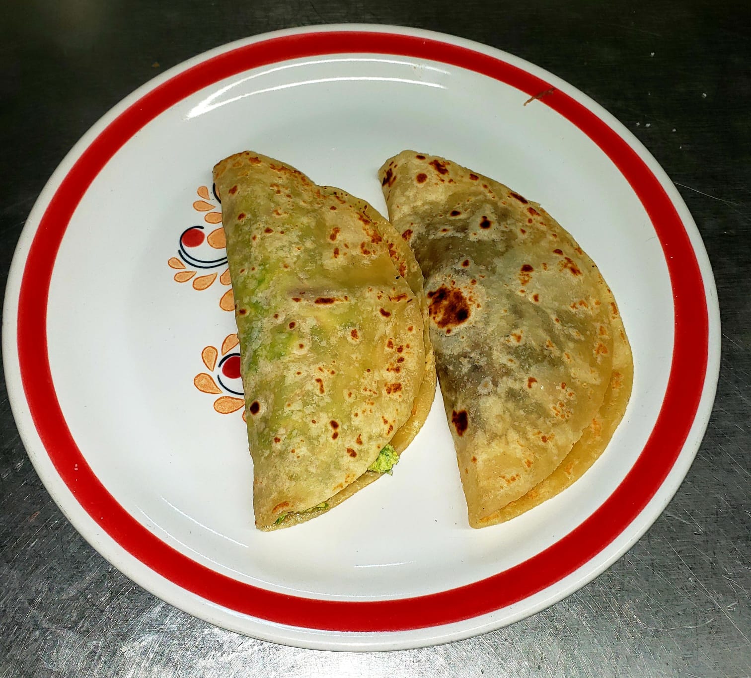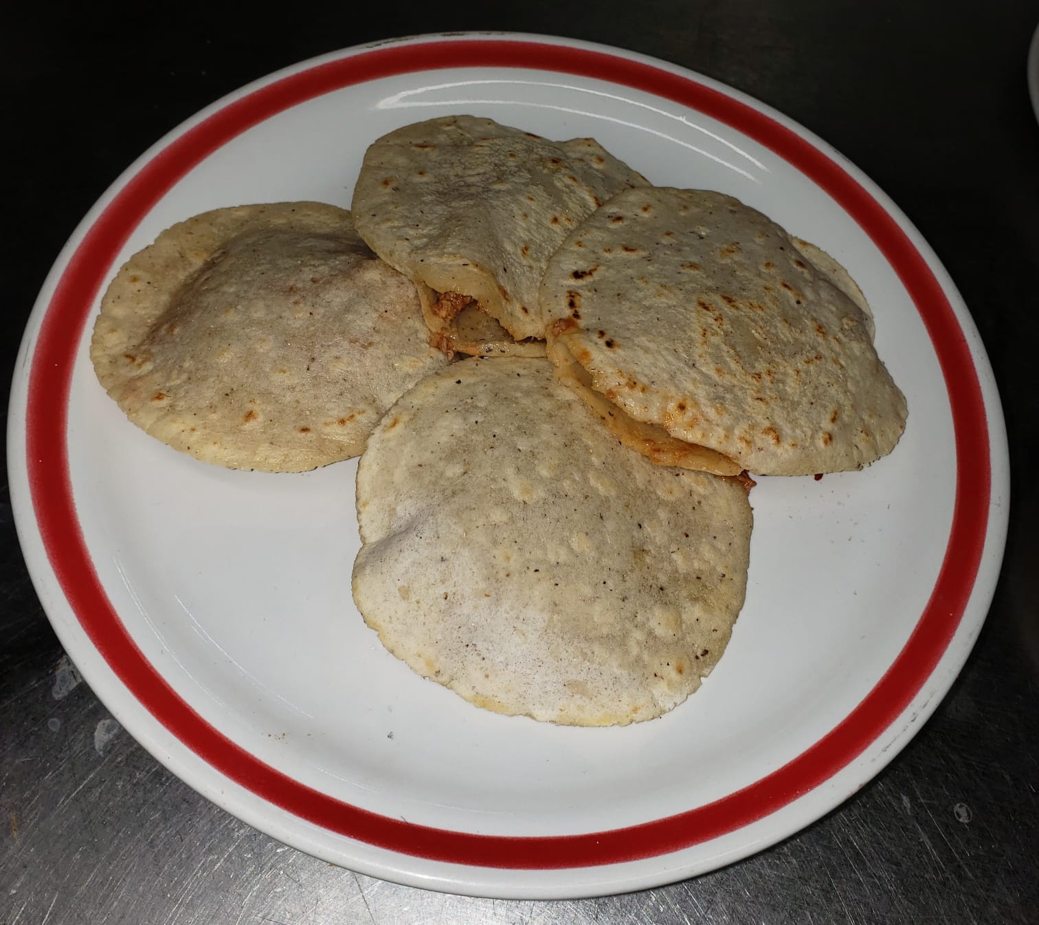 Tortilla normal con cebolla, cilantro, queso y aguacate.
