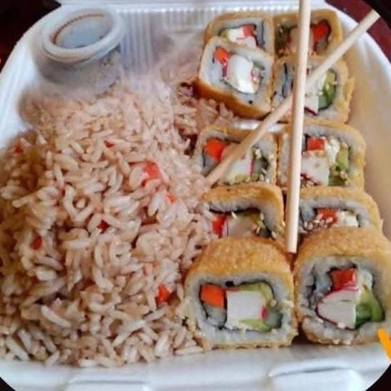 Sushi alga por fuera relleno de camarón,pollo y carne, incluye 1 Guiso y guarnición arroz o pasta