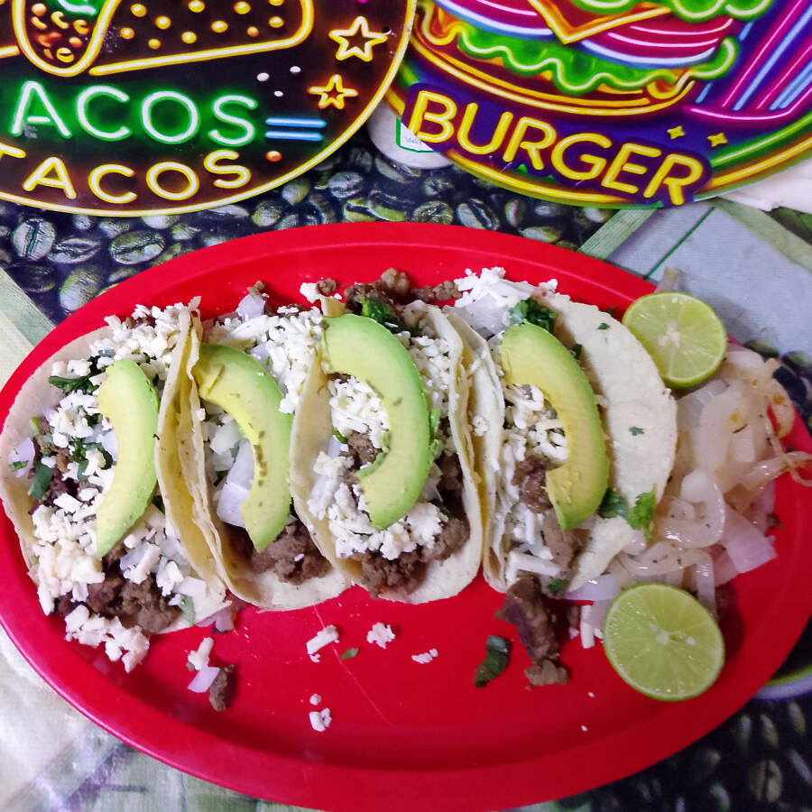 Tacos Mixtos de Pastor y Bistec con Queso, Aguacate, Cilantro, Cebolla y Cebolla asada